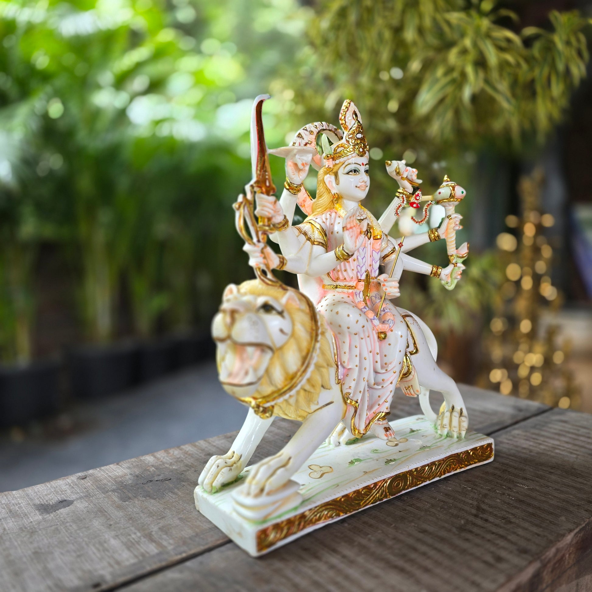 17" Durga Devi sitting on lion in Cultured Marble, these days artifacts in cultured marble are being considered as a good alternative to marble artifacts; the primary reason being the cost effectiveness and also the spotless beauty, in marble darker grains can be visible anywhere including the face. Depth and beauty can be enhanced with proper colour application like this Durga Devi.