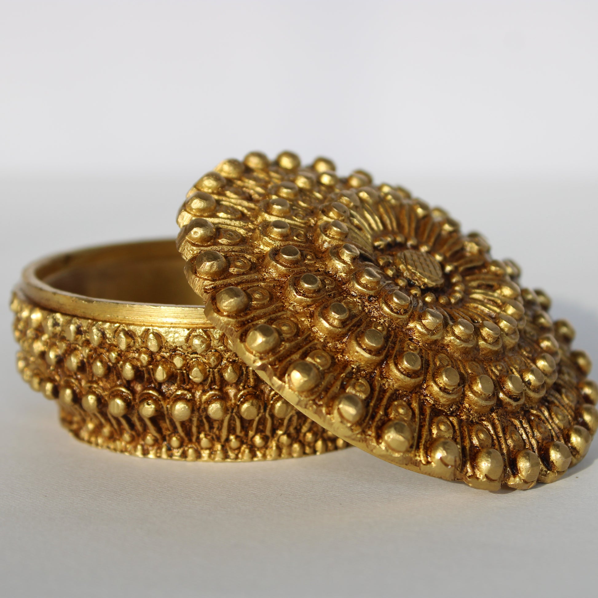 2" Kumkum Box In Brass. Bring a touch of timeless tradition and enduring craftsmanship into your home with Shaaranga collection of exclusive gift sets, handcrafted in brass. These gift sets are very ideal for any kind of special occasion whether it is an important personal occasion like Gruhapravesam(House warming), Marriage or Just a remembrance gift. They are also ideal for festival gifts like Sankranti, Deepavali or even a New Year. They are also ideal corporate gifts as they are cherishable and remain for a long time with the beneficiary. Each piece is a testament to the skill of our artisans who have perfected the art of metalworking through generations. The intricate patterns and delicate engravings reflect centuries of tradition and a mastery passed down through families. The warm, golden hue of this copper and zinc alloy adds a versatile and elegant accent, complementing both traditional and modern decor.