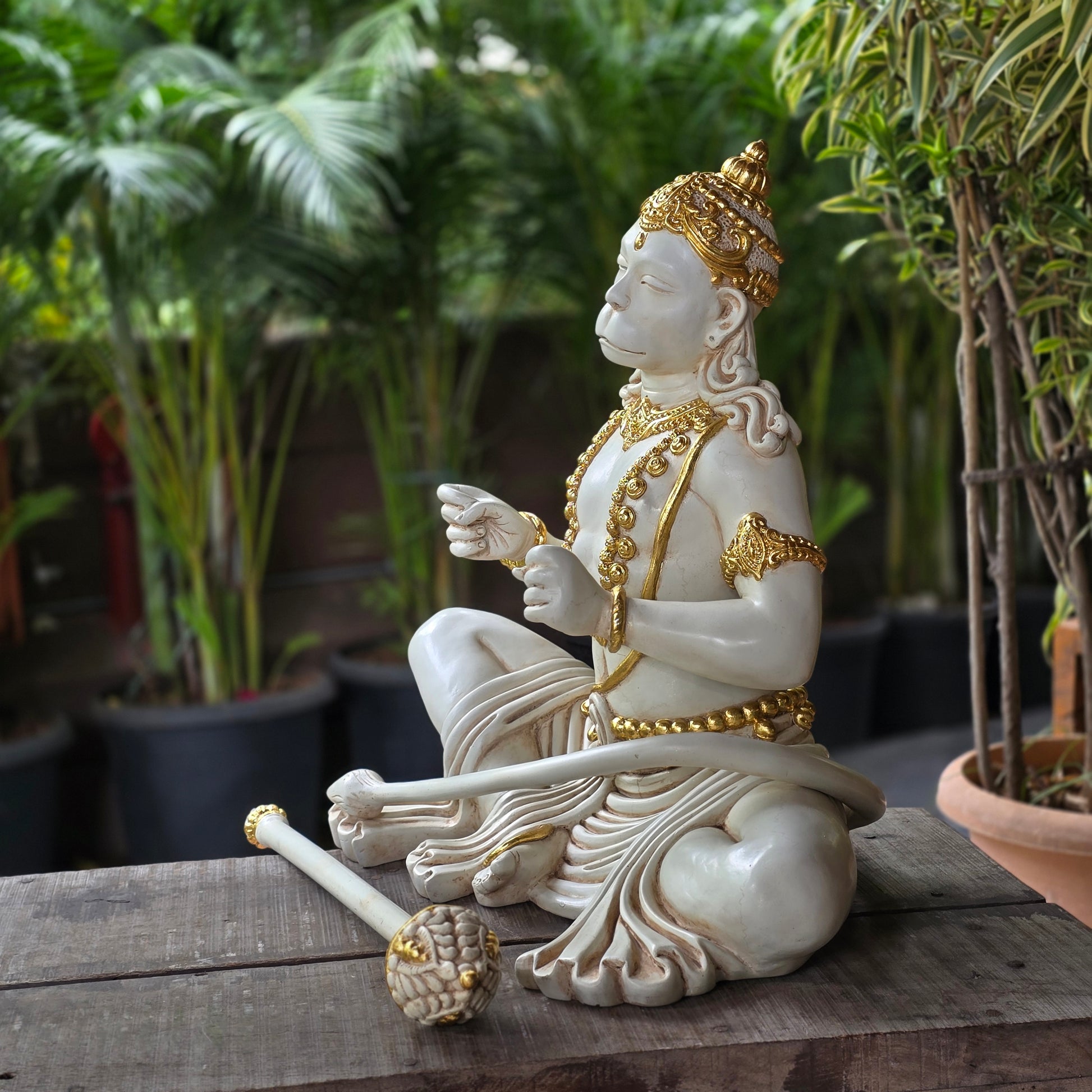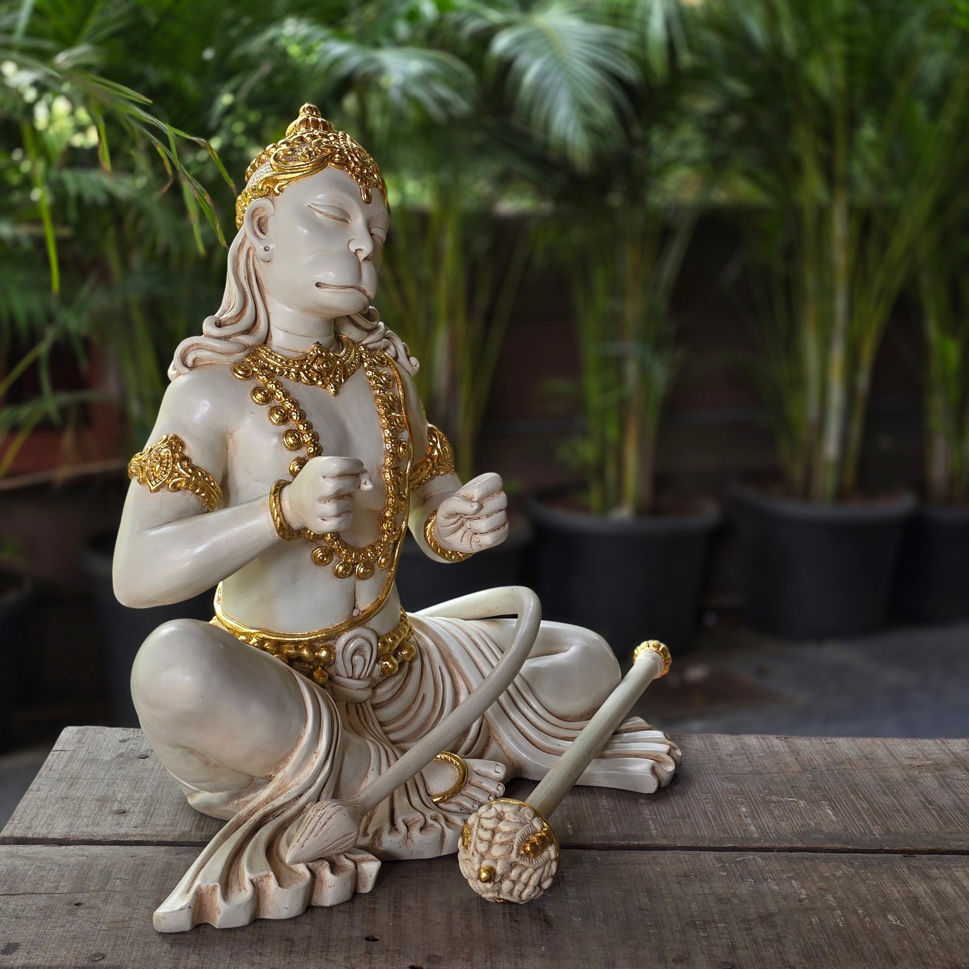 21" Dhyana Hanuman in Culture Marble This is a very unusal artifact depecting Lord Hanuma in dhyana mudra. The body language of Maruthi is something like surrendering himeslef to his lord Sri Rama, with a very devine feeling on face it looks like lord Hanuman is in intense dhyana mudra. Lord Hanumans ayudham (Mace) is created seperatly so that it can be placed depending on the space and Aesthitic value.