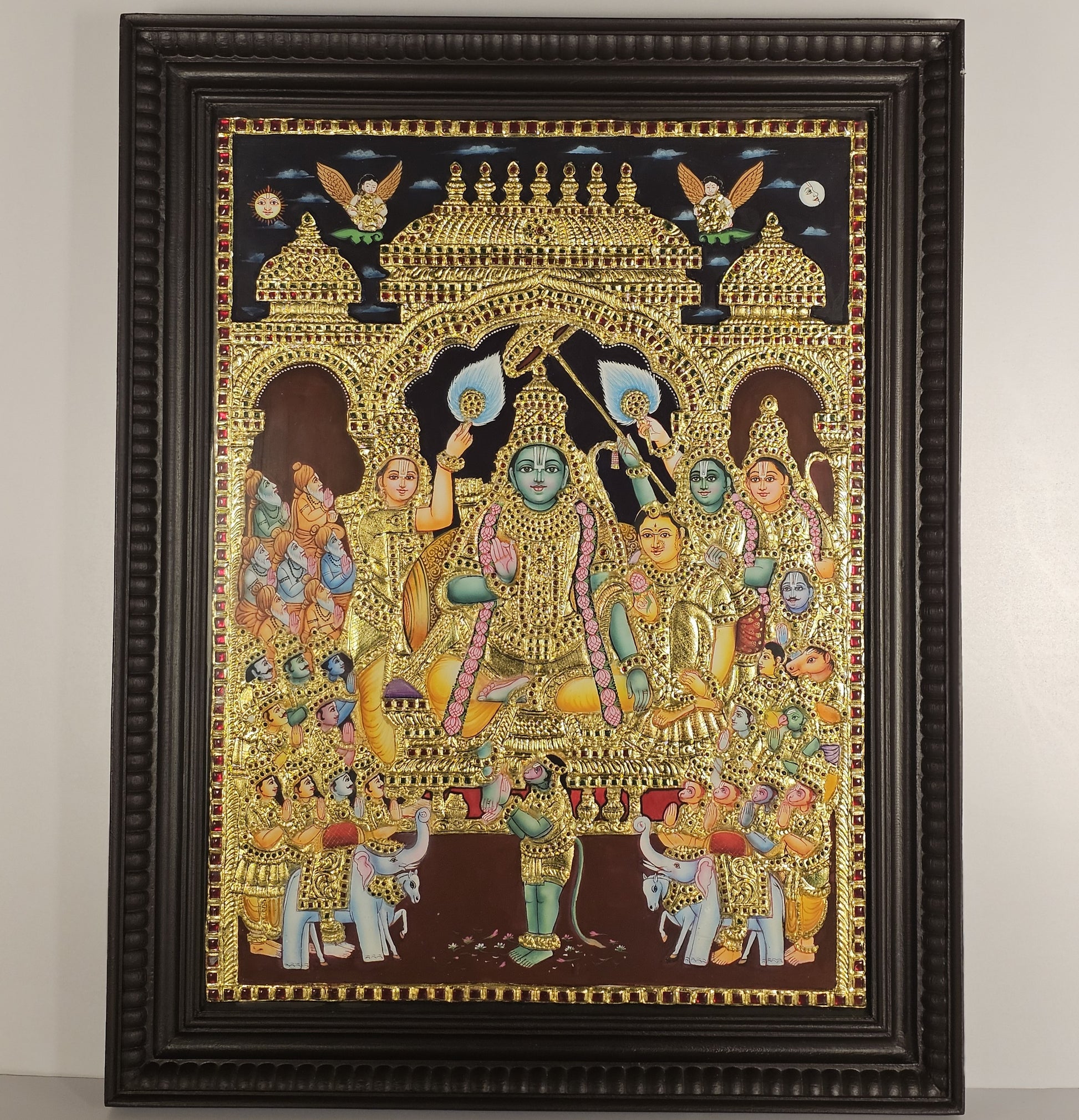 28" Rama Pattabhishekam Tanjore Painting with 22K Gold Work Tanjore school of painting is among the fore most paintings style of south India. The technique of painting on wood or clothe in Tanjore school is very unique. This art form is known for its vibrant colours, great composition and expressive faces. The Tanjore Paintings carry relief work which is more pronounced than other similar school of paintings. Besides employing pure gold leaf to cover parts of the paintings, Tanjore painting are also embellished with coloured stones, beads, and mirrors, adding an additional layer of texture and visual interest.