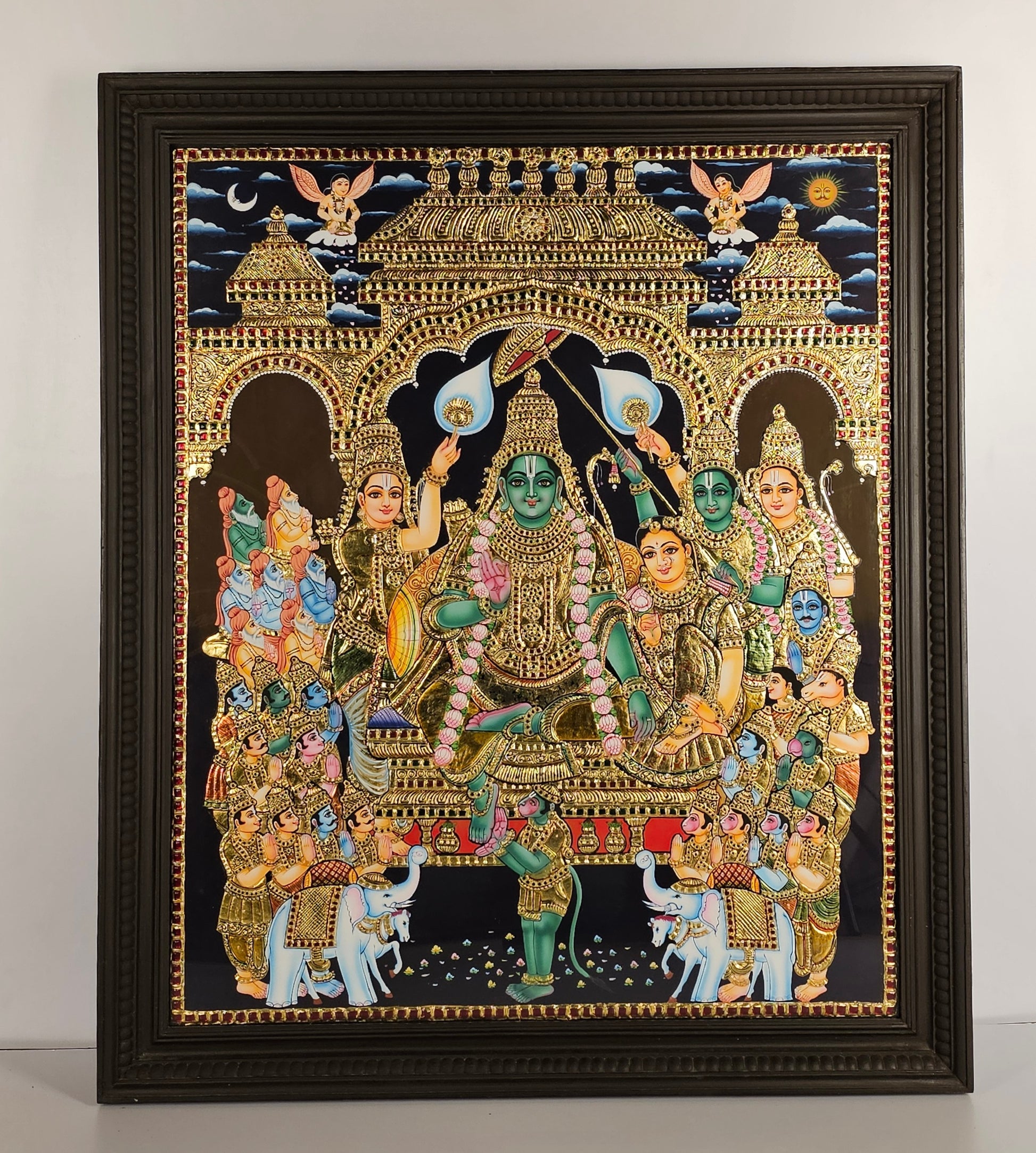 While the traditional techniques have remained largely unchanged particularly among the senior artisans from the traditional artisanal families, contemporary Tanjore painters are experimenting with new materials, designs, and subjects. Today, Tanjore paintings are popular as decorative items and spiritual artworks, often found in temples, homes, and galleries worldwide. It is always advisable to procure Tanjore paintings from genuine sources like Shaaranga as it is felt that several shortcut methods are being used in the market to make and deliver quickly, at Shaaranga every care is taken to ensure the genuineness of the raw materials like Gold leaf, stones, emboss technique and the process, we always encourage the traditional families whose forefathers have been instrumental in protecting these art forms.