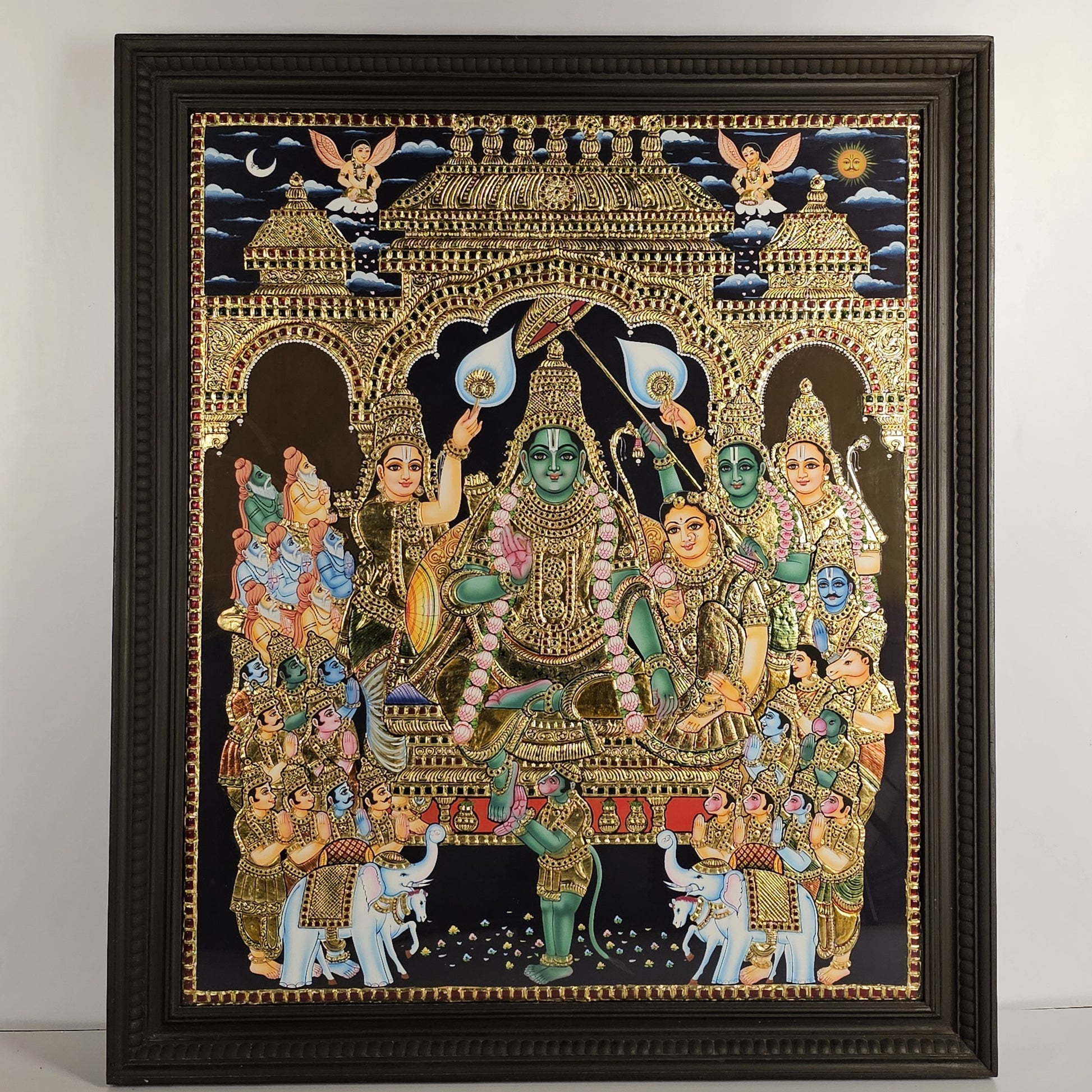 34" Rama Pattabhishekam Tanjore Painting with 22K Gold Work Tanjore school of painting is among the fore most paintings style of south India. The technique of painting on wood or clothe in Tanjore school is very unique. This art form is known for its vibrant colours, great composition and expressive faces. The Tanjore Paintings carry relief work which is more pronounced than other similar school of paintings. Besides employing pure gold leaf to cover parts of the paintings, Tanjore painting are also embellished with coloured stones, beads, and mirrors, adding an additional layer of texture and visual interest.