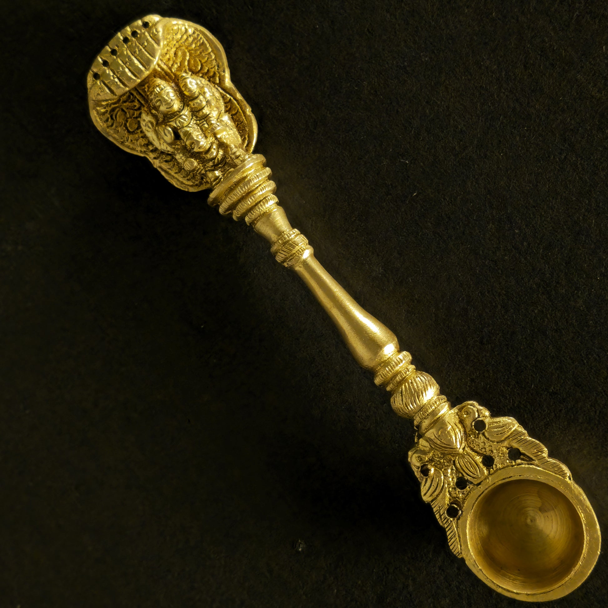 6.5" Vishnu Lakshmi Spoon In Brass. Bring a touch of timeless tradition and enduring craftsmanship into your home with Shaaranga collection of exclusive gift sets, handcrafted in brass. These gift sets are very ideal for any kind of special occasion whether it is an important personal occasion like Gruhapravesam(House warming), Marriage or Just a remembrance gift. They are also ideal for festival gifts like Sankranti, Deepavali or even a New Year. They are also ideal corporate gifts as they are cherishable and remain for a long time with the beneficiary. Each piece is a testament to the skill of our artisans who have perfected the art of metalworking through generations. The intricate patterns and delicate engravings reflect centuries of tradition and a mastery passed down through families. The warm, golden hue of this copper and zinc alloy adds a versatile and elegant accent, complementing both traditional and modern decor.