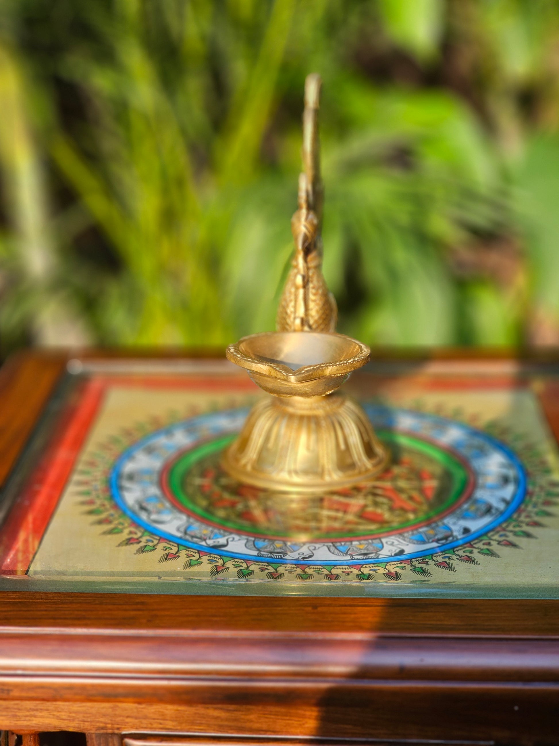 Every curve of this lamp is meticulously hand-carved by skilled artisans. The intricate feather patterns, delicate beak, and beautifully arched tail reflect the finesse of traditional South Indian temple craftsmanship. The design exudes a regal aura, making it both a functional lamp and a statement piece of art.