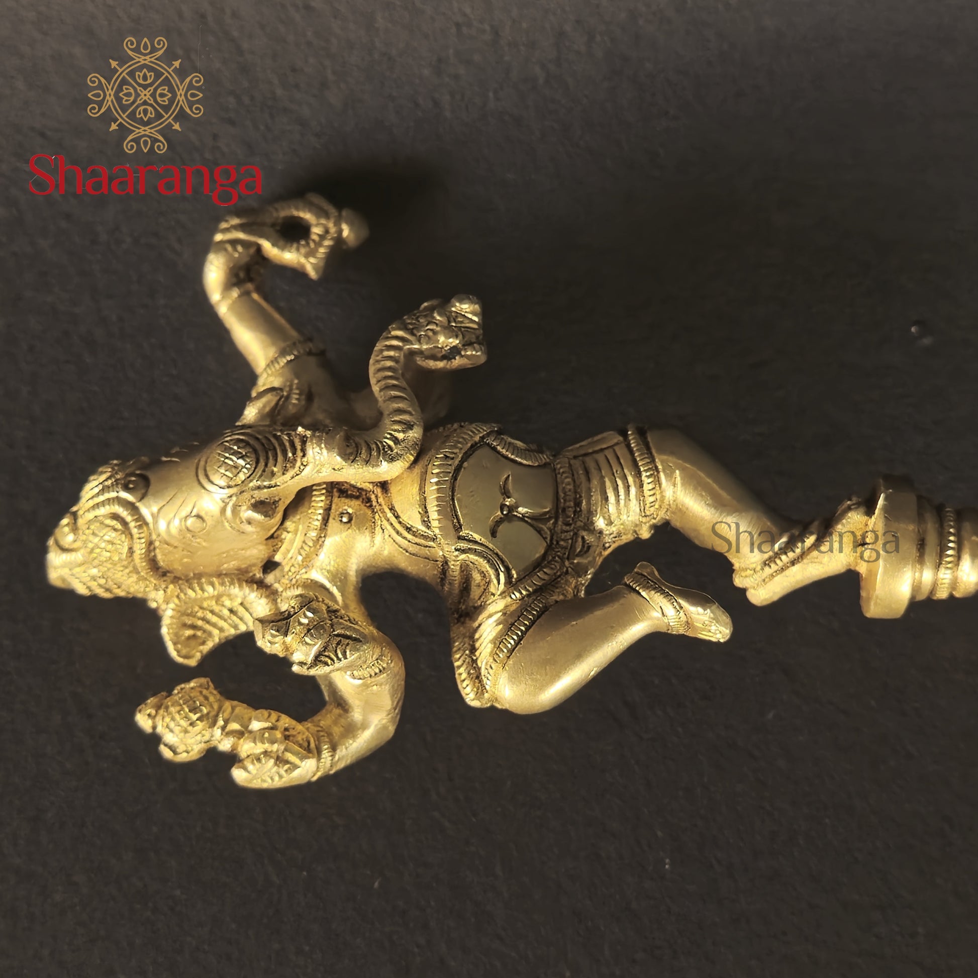 At the crown of the handle is a beautifully sculpted Lord Ganesha in dynamic posture, symbolising auspicious beginnings and the removal of obstacles before every ritual act. The finely detailed form — from the expressive trunk to the traditional ornaments — reflects classical South Indian brass artistry.