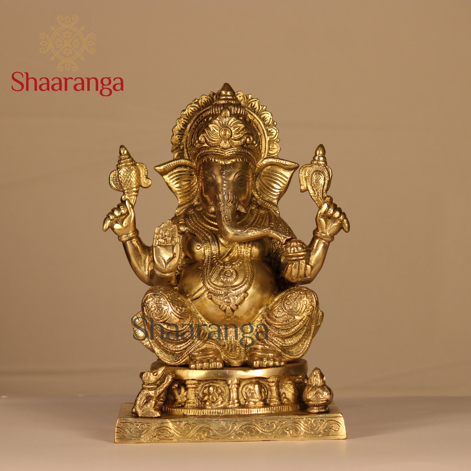 11 Inches Brass Ganesha Sitting On Base Idol.