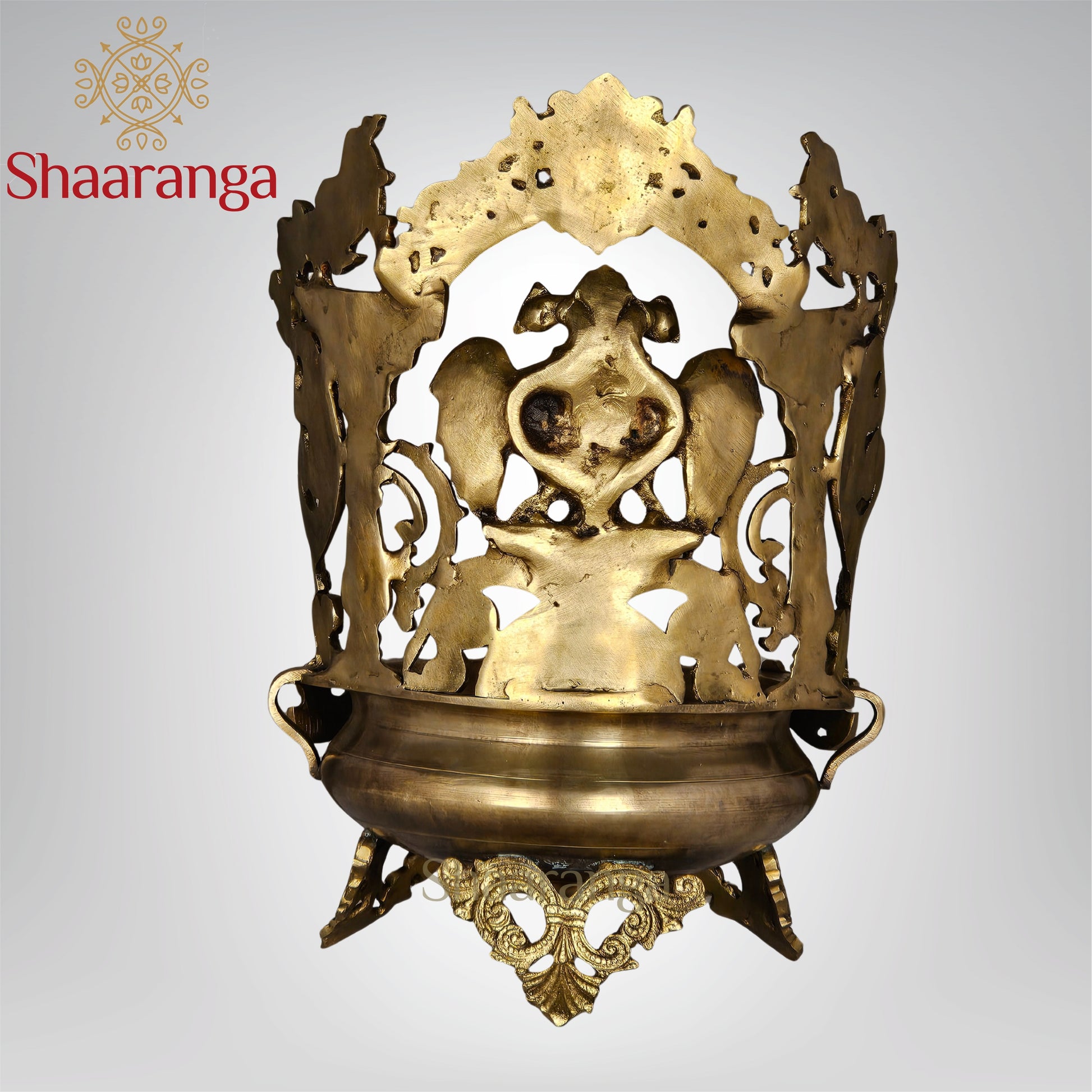 This exquisite bronze urli from Shaaranga features a finely detailed depiction of Peocock, the divine embodiment of love, joy, and harmony, surrounded by graceful peacocks, symbols of beauty, grace, and spirituality.
