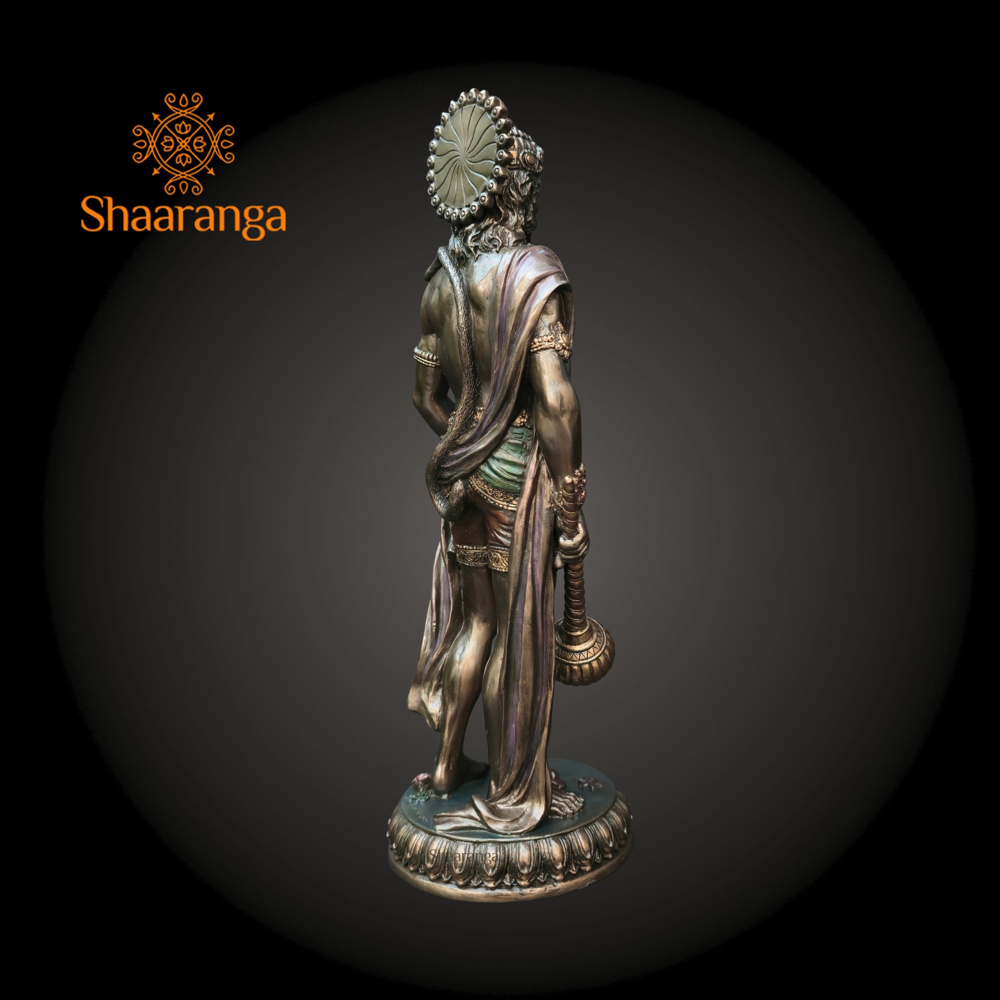 This 24-inch fiber Hanuman figurine is a striking representation of Lord Hanuman in his majestic and powerful form. Sculpted with excellent body proportions and muscular definition, the figure radiates strength, courage, and unwavering devotion. Every detail is rendered with precision, from the expressive facial features to the dynamic posture that conveys readiness and resolve. The Gada (mace), a symbol of immense power and righteousness, is crafted with exceptional finesse, reflecting the artisan’s mastery. Made from high-quality fiber, the statue is sturdy yet lightweight, ensuring durability and ease of placement. This figurine is ideal for home, spiritual corners, gyms, offices, or as a meaningful devotional gift.