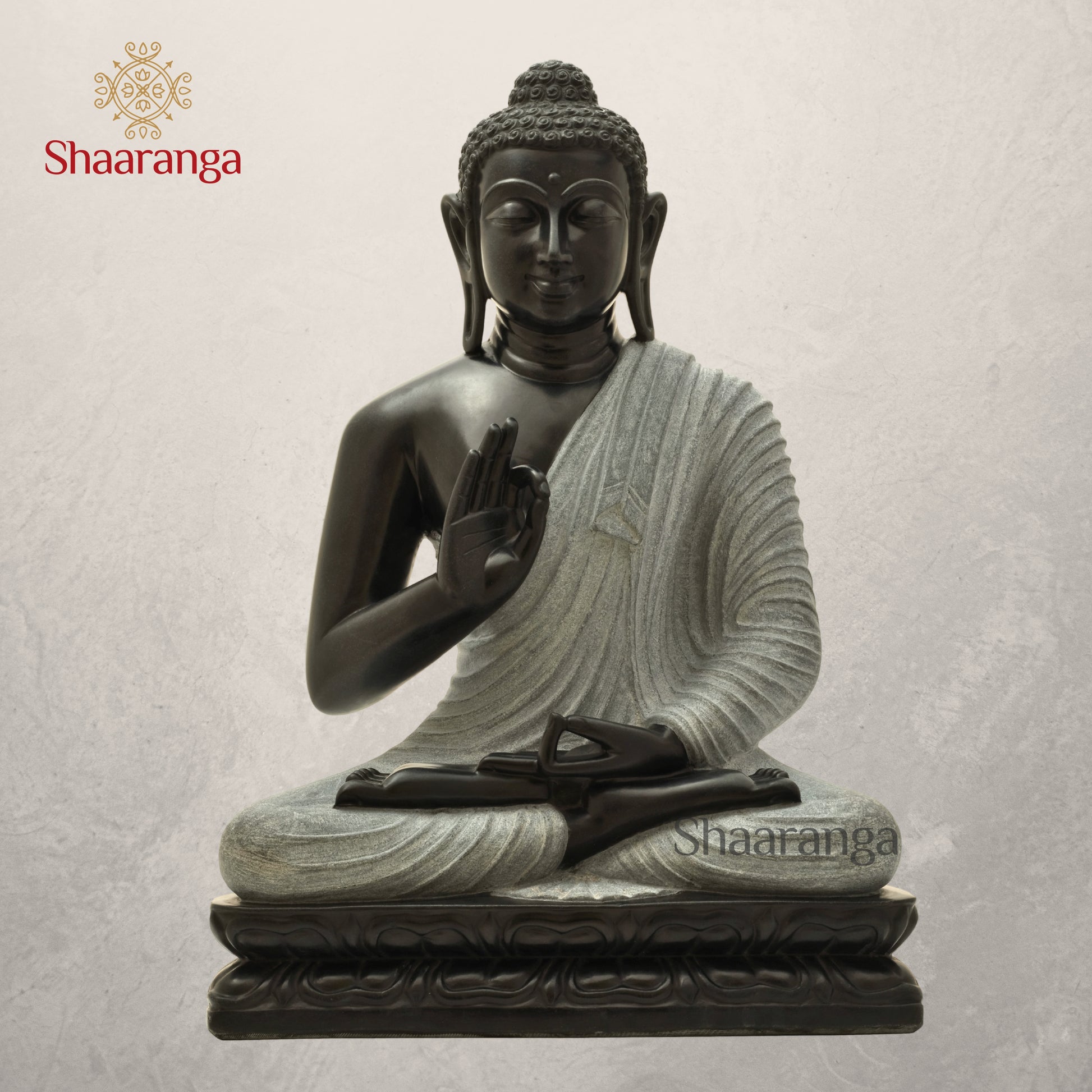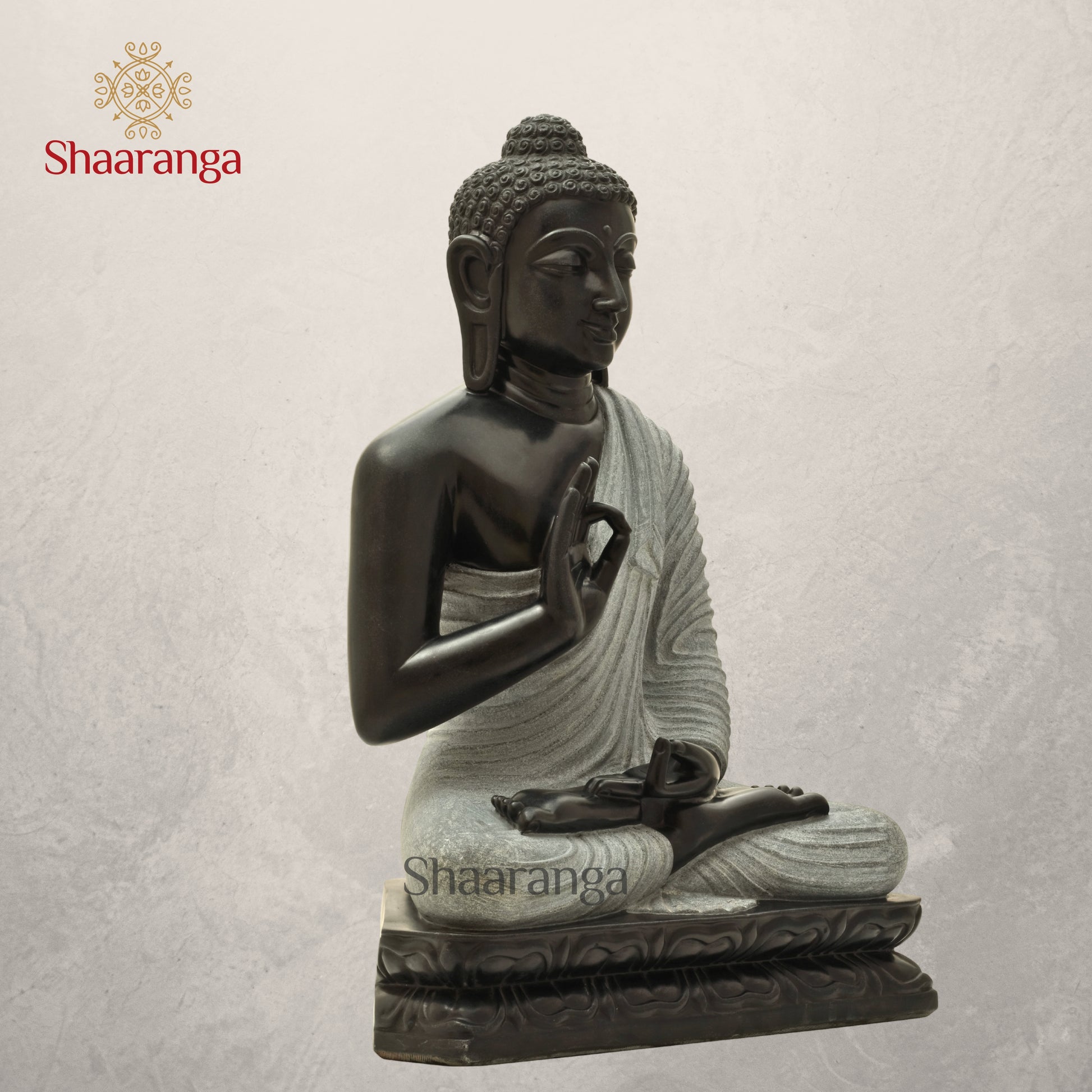 This magnificent 26 inches black marble Buddha statue embodies the profound tranquility and spiritual depth of Buddhist philosophy. Hand-carved from premium quality marble, each piece showcases the natural beauty of deep black stone with subtle veining that makes every sculpture unique.