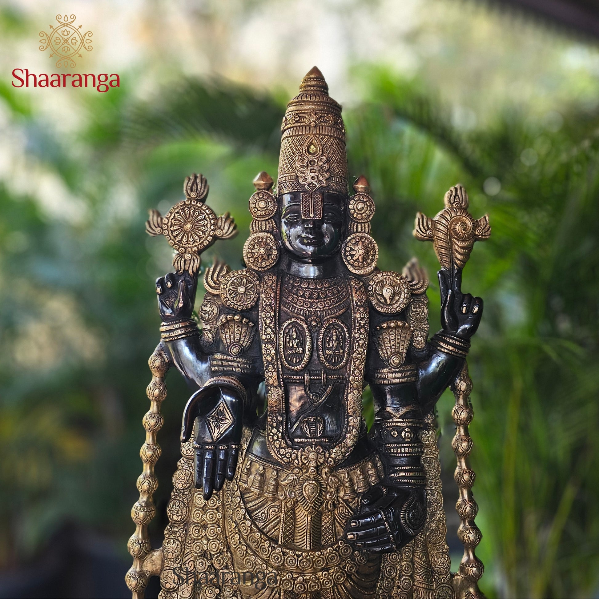What distinguishes this sculpture is its remarkable visual depth and authentic temple tone. The body of the deity is finished in a rich darker Balaji tone, reminiscent of the sacred idol of Tirumala. This darker finish contrasts beautifully with the intricate golden ornaments, creating a stunning visual harmony that highlights every sacred detail.